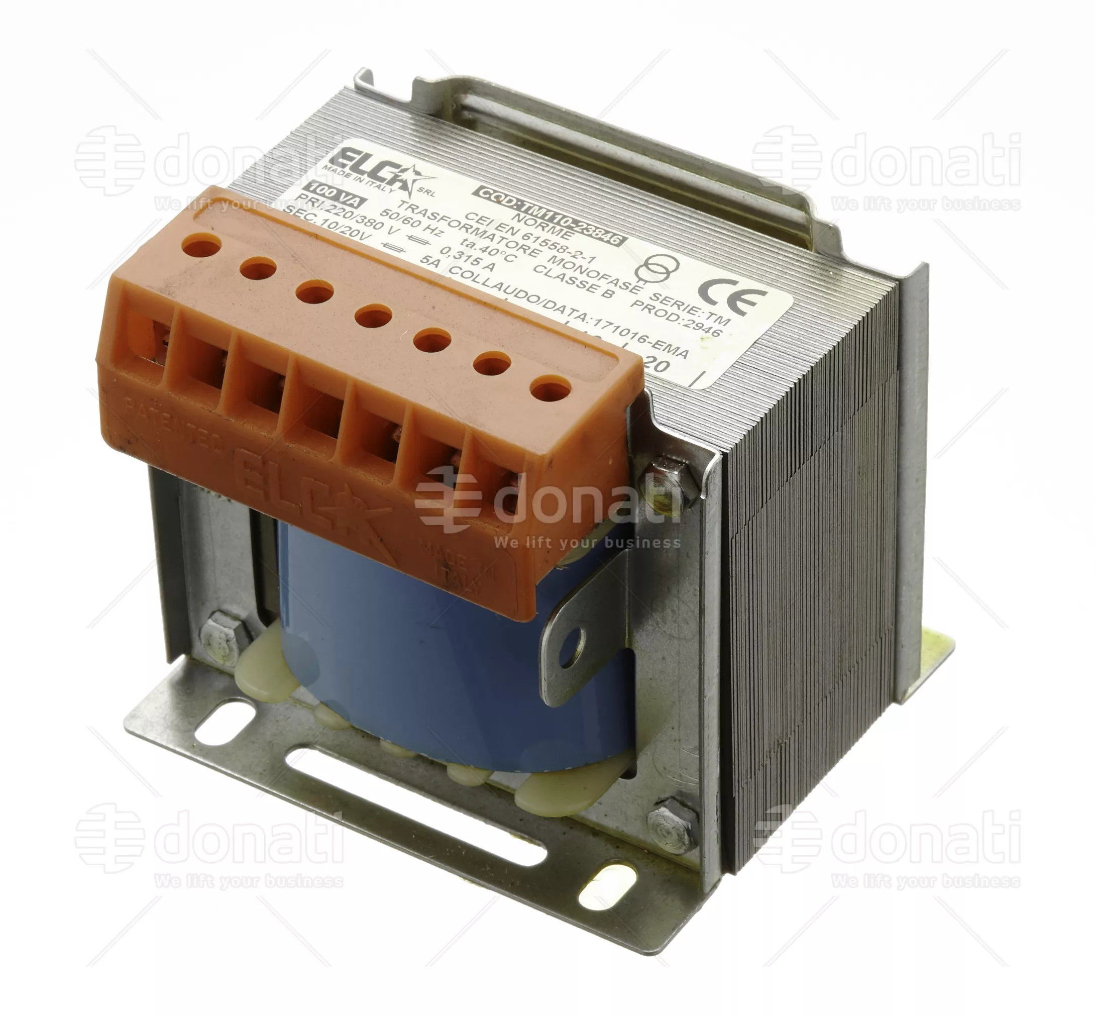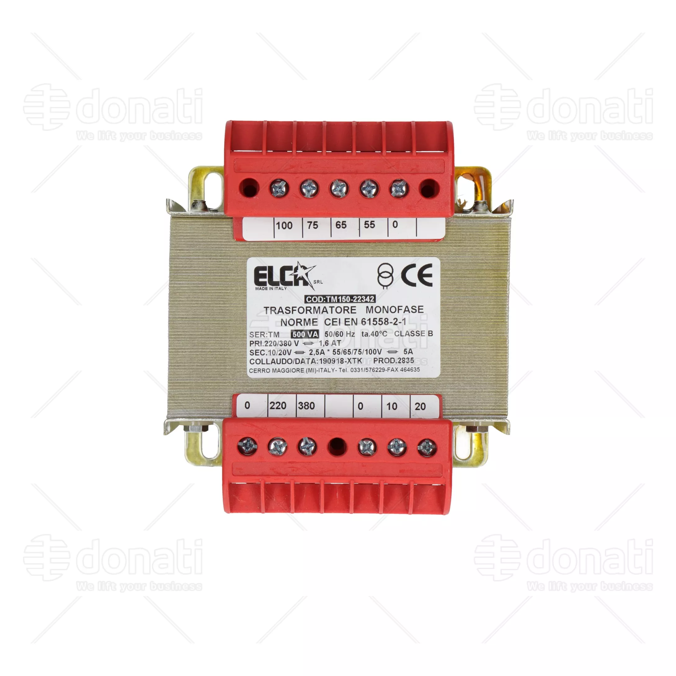 TRASFORMATORE MONOFASE 500 VA, , CARATTERISTICHE TECNICHE , Classe termica di isolamento B, Frequenza 50/60 Hz, Esecuzione aperta. Grado di protezione IP00, Nucleo realizzato con lamierini a basse perditeTensione di isolamento tra Primario 0-220-380 e Secondario 0-55-65-75-100/ 0-10-20, Dimensioni: 120x122x135, Potenza: 500 VA , Temperatura ambiente max 40° C, Telaio con connessione di terra, Impregnati in resina e tropicalizzati, Classe elettrica di protezione I , A richiesta schermo tra Primario e Secondario, A richiesta sistema di isolamento omologato , file number 080705-E255070 ,